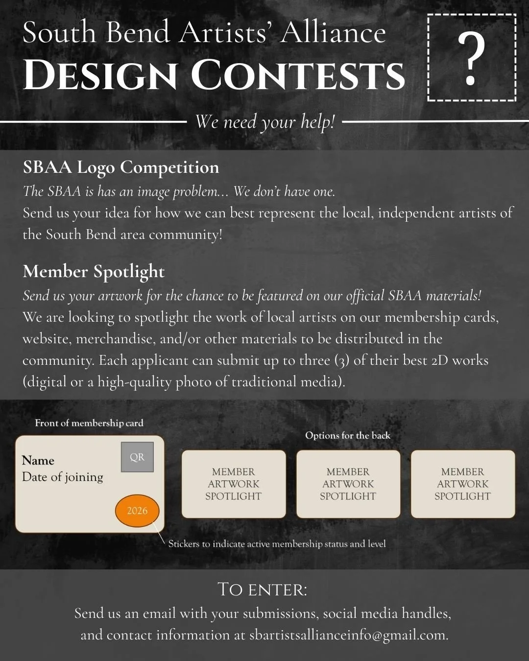 For more information about the South Bend Artists’ Alliance programming, membership, or Design Contest, please visit our website, sbartistsalliance.com, or email us at sbartistsallianceinfo@gmail.com.