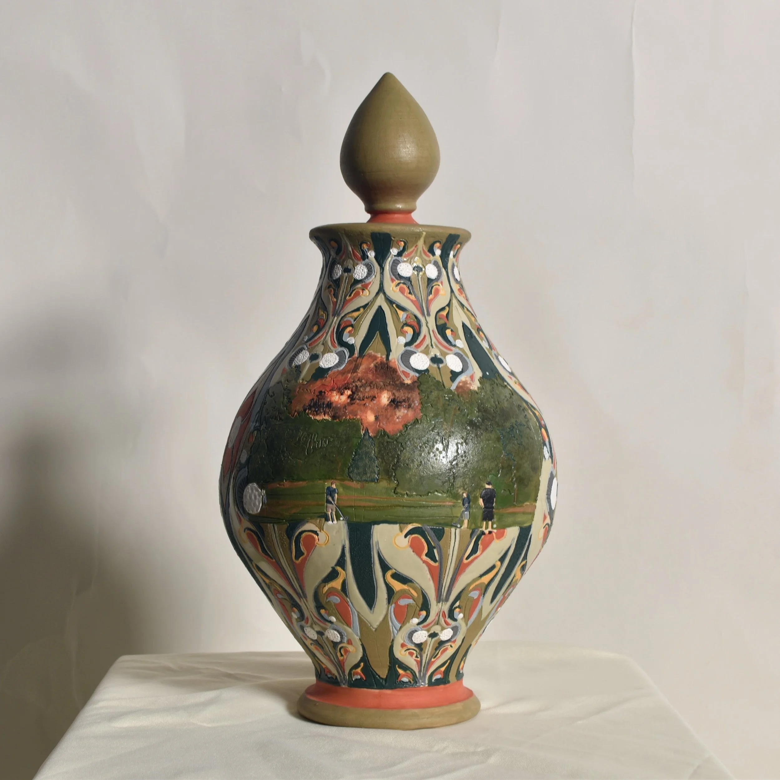 helped to shape her artistic sensibilities early on. “I think of being forged in a crucible—going to public school with American kids and coming home and being steeped in Ukrainian culture that I was experiencing secondhand through the people who brought it here.” In one of her urns, she breaks away from the rhythmic floral pattern to show the impact of oppression. She tells this story using a simple, bare scene of families in the former Soviet Union waiting for food in a breadline.